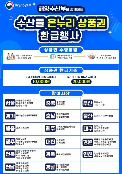 이번 행사는 전국 38개 시장에 있는 3,910개 점포와 연계하여 진행하며, 행사 품목은 광어·우럭·참돔·전복 등 양식수산물을 포함한 국내산 수산물과 젓갈 등 국내산 수산물 원물을 활용한 가공품이다. 소비자들은 각 전통시장 안에 있는 행사부스에서 당일 구매한 수산물 금액의 최대 30%(1인당 2만 원 한도)를 온누리상품권으로 환급받을 수 있다. 자세한 내용은 행사 공식 누리집에서 확인하면 된다.