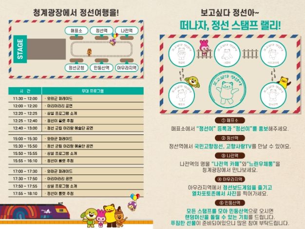 특설무대에서 뮤지컬 '아리아라리' 갈라공연과 정선군립예술단의 특별공연이 진행되고, 정선역, 아우라지역 등 미니기차역에 들려 스탬프 랠리를 완성한 참여자에게는 푸짐한 선물도 증정한다.