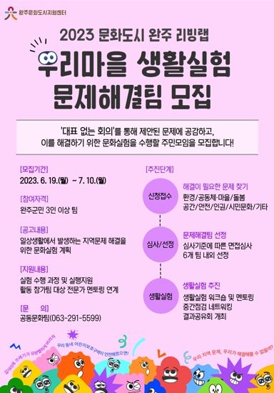 [제주교통복지신문 김강석 기자] 완주문화도시지원센터는 주민 주도적 지역문제 해결방안을 찾는 ‘문화도시 완주 리빙랩 : 2023 우리마을 생활실험’ 사업 참여 팀을 오는 7월 10일까지 모집한다.