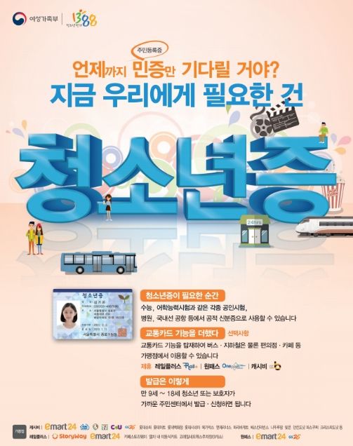 청소년증이 있으면 놀이공원, 영화관, 공연장 등 문화시설에서 이용료를 할인받을 수 있다. 교통카드 기능도 있어 버스, 지하철 등 대중교통을 이용할 때도 편리하다. 청소년증은 주소지와 무관하게 가까운 동 행정복지센터에서 신청해 무료로 발급받을 수 있다.