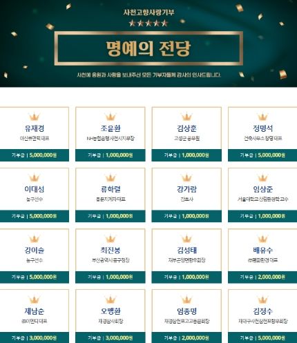 명예의 전당은 100만 원부터 기부 최대 한도액인 500만 원까지 기부한 기부자의 이름과 소속 등을 게시하는 형태로 운영된다.