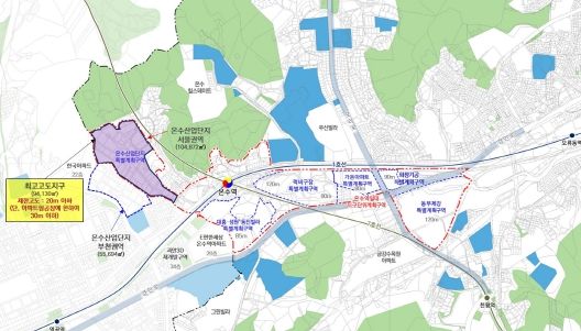 1971년 시가지의 무질서한 확장을 막기 위해 풍치지구로 결정된 대상지 일대는 약 20년 뒤 최고고도지구로 변경 결정되면서 건축 높이가 20m 이하(아파트형 공장은 30m 이하)로 제한돼왔다.