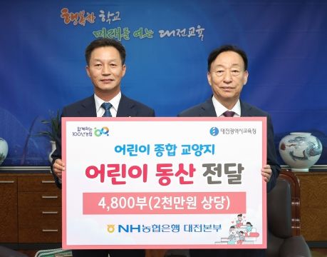 [제주교통복지신문 김강석 기자] 대전광역시교육청은 6. 30 NH농협은행 대전본부로부터 2천만 원 상당의 어린이 종합 교양지 '어린이동산' 4,800부를 기탁받았다고 밝혔다.