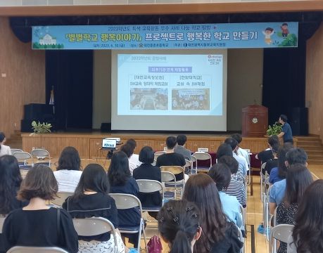 [제주교통복지신문 김강석 기자] 대전광역시동부교육지원청은 6. 30 대전중촌초등학교에서 동부 관내 유치원 및 초등학교 교원을 대상으로 '별별학교 행복이야기' 프로젝트 운영 우수학교 탐방을 실시했다고 밝혔다.