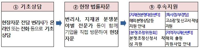 이를 해결하기 위해 변리사, 지재권전문가 등이 기업에 찾아가서 맞춤형 자문을 제공하는 지재권분쟁 통합(원스톱) 현장자문이 추진된다. 수도권뿐만 아니라 지재권전문가가 부족한 비수도권 지역에서도 효과적인 지재권분쟁 대응전략을 안내받을 수 있을 것으로 기대된다.