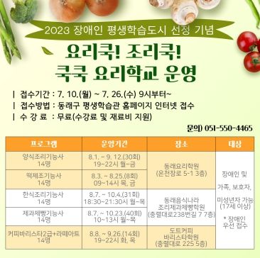 [제주교통복지신문 김강석 기자] 부산 동래구는 2023 장애인 평생학습도시 선정을 기념해 장애인과 장애인 가족을 위한 ‘요리쿡! 조리쿡! 쿡쿡 요리학교’를 운영한다고 밝혔다.