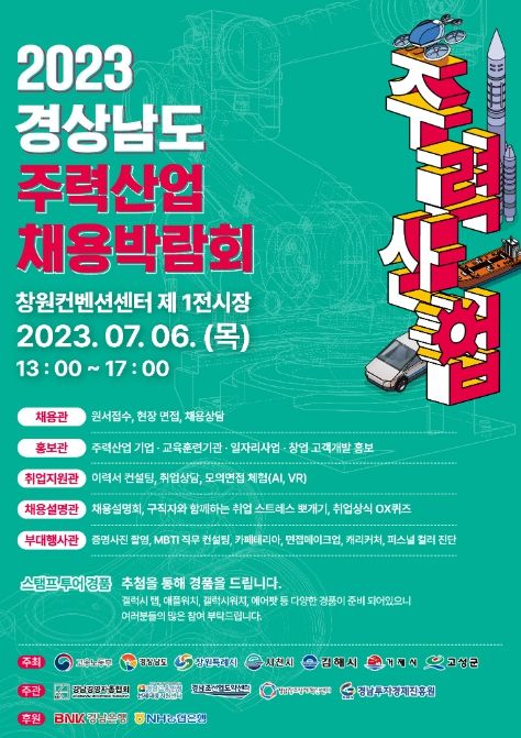 [제주교통복지신문 김강석 기자] 경상남도는 오는 7월 6일 창원컨벤션센터 제1전시장에서 조선, 자동차·기계, 우주항공 분야 고용 촉진을 위한 ‘2023 경상남도 주력산업 채용박람회’를 개최한다고 밝혔다.