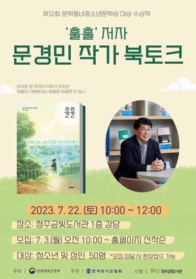 [제주교통복지신문 김강석 기자] 청주금빛도서관은 오는 7월 22일 오전 10시부터 2시간가량 청소년 및 성인을 대상으로 청소년 문학 작가 북토크를 운영한다고 밝혔다.