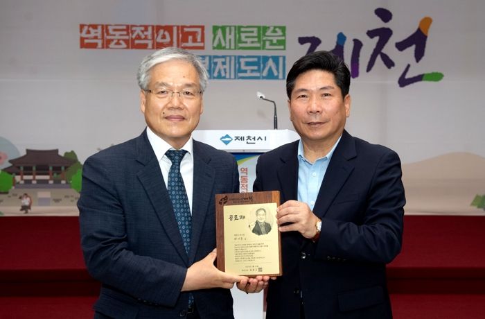 이 자리에서 김창규 제천시장은 지난 1년 간 ‘역동적이고 새로운 경제도시 제천’ 건설을 위해 헌신한 박 부시장에게 13만 제천시민의 마음을 담은 공로패와 명예시민패를 전달했다.