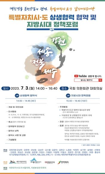이날 포럼에서는 제주대학교 민기 교수가 ‘특별자치시도 상생협력의 필요성과 방향’을, 인하대학교 이기우 명예교수가 ‘지방분권 및 지역균형 방향과 과제’에 대해 발표하고 패널토론이 진행된다.
