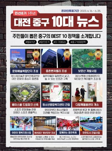 [제주교통복지신문 김강석 기자] 대전 중구가 민선8기 1주년을 맞아 주민이 선정한 ‘중구 10대 뉴스’를 발표했다.
