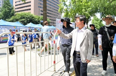 이후 퀴어 축제가 열리는 을지로 일대를 찾아 행진 예정 구간을 걸으며 밀집 인파의 안전을 위협하는 요소는 없는지 꼼꼼히 살폈다. 이날 중구청에서는 80여명의 직원이 질서유지와 안전사고 예방을 위해 현장에 투입됐다. 김 구청장은 주말 33도에 이르는 무더위 땡볕에서 근무하는 직원들을 찾아 노고를 격려했다.