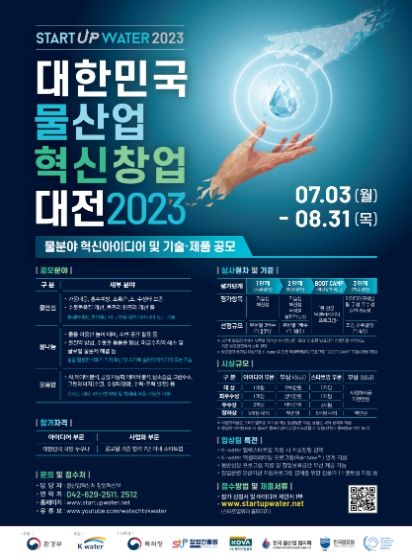 [제주교통복지신문 김강석 기자] 환경부와 한국수자원공사(사장 윤석대)는 물산업에 대한 국민적 공감대 형성과 유망 강소 물기업을 육성하기 위해 7월 3일부터 8월 31일까지 ‘2023 대한민국 물산업 혁신 창업대전(Startup Water 2023)’ 공모를 시작한다.