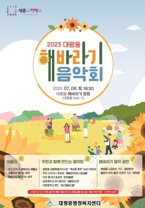 [제주교통복지신문 김강석 기자] 세종특별자치시 대평동이 오는 8일 숲바람 수변공원 해바라기 정원에서 ‘해바라기 음악회’를 개최한다.