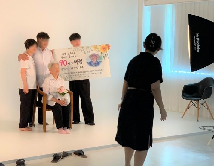 ‘추억 담은 사진관’은 일 년에 두 번 6월, 10월에 진행된다. 올해는 6월 10일, 한강미디어고등학교에서 사진영상학과 학생, 메이크업·헤어 봉사자 20명이 참여해 치매 어르신 10명의 가족사진을 촬영했다.