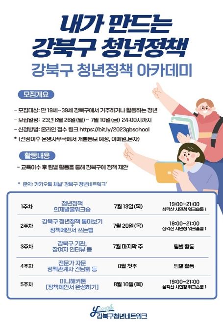 [제주교통복지신문 김강석 기자] 서울 강북구가 오는 7월 10일까지 ‘2023년 청년정책 아카데미’에 참여할 젊은 주인공들을 찾는다.