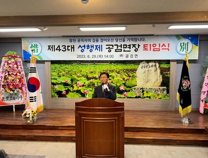 [제주교통복지신문 김강석 기자] 공검면은 지난 6월 29일(목) 공검면 행정복지센터 2층 회의실에서 가족, 도·시의원, 기관·직능단체장, 직원 등 100여 명이 참석한 가운데, 제43대 성행제 공검면장 퇴임식을 개최했다고 밝혔다.