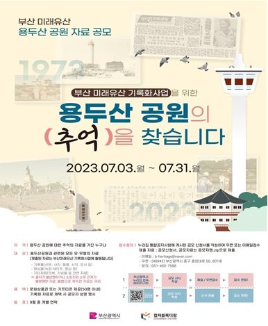 부산시 관계자는 “용두산공원에 대한 심층 연구와 다방면의 자료를 집대성하여 미래유산으로서의 가치를 미래세대에 보전토록 노력하겠다”면서 “자료 공모에 시민들의 많은 관심과 참여를 바란다”라고 전했다.