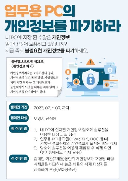 [제주교통복지신문 김강석 기자] 보령시는 개인정보보호 수준을 제고하기 위해 오는 8월 31일까지 전 직원을 대상으로 ‘개인정보파일 파기 캠페인’을 실시한다.