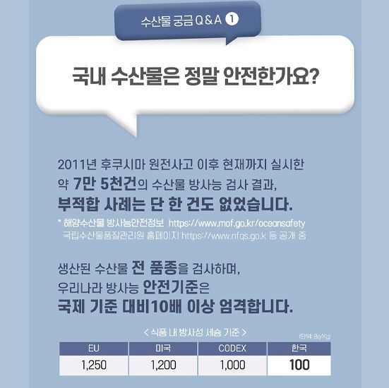 아울러, 2011년 후쿠시마 원전사고 이후 현재까지 실시한 약 7만 5천건의 생산·유통단계 수산물 방사능 검사 결과, 부적합 사례는 단 한 건도 없었습니다.