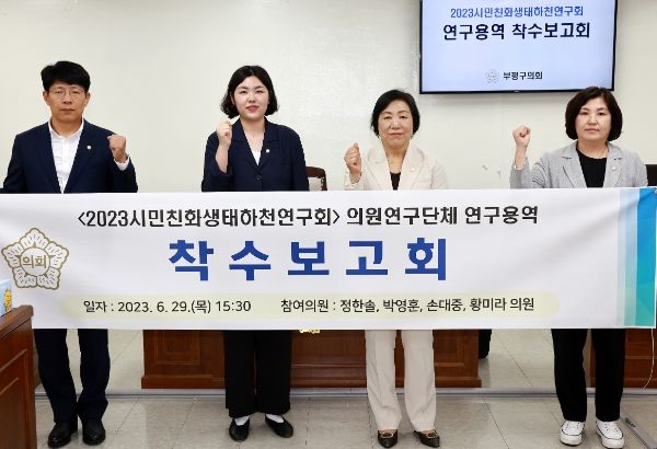 [제주교통복지신문 김강석 기자] 부평구의회 의원연구단체인 ‘2023시민친화생태하천연구회’은 29일 행정복지위원회실에서 '굴포천 생태하천의 시민친화형 복원 방안을 위한 정책과제 발굴'을 과업으로 하는 연구용역 착수보고회를 개최했다