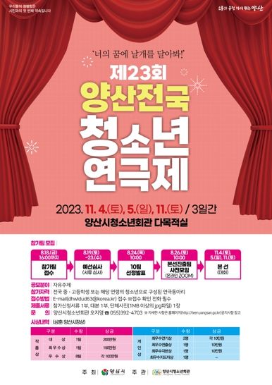 [제주교통복지신문 김강석 기자] 제23회 양산전국청소년연극제가 양산시 주최, 양산시청소년회관 주관으로 11월 4일, 5일, 11일 3일간 개최된다.