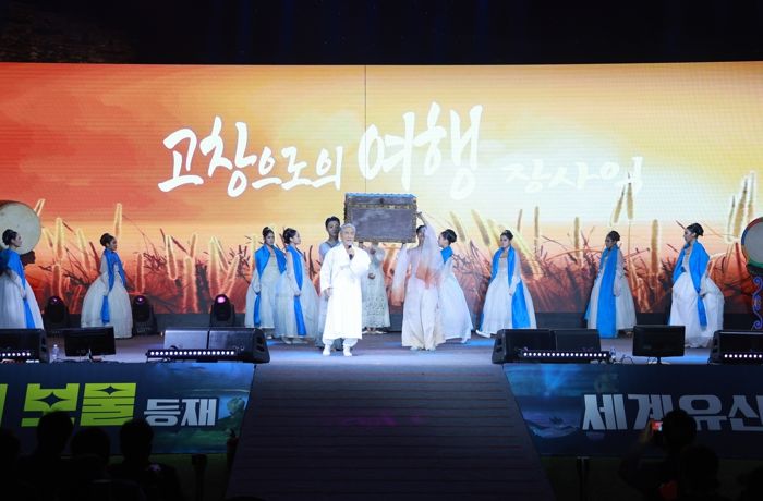 고창 대표 국악뮤지컬인 ‘이팝:소리꽃’ 공연을 시작으로 전문무용수들과 관광객, 군민이 함께 어울어져 선보인 7가지 보물 등재 축하 퍼포먼스는 장관을 연출했다.