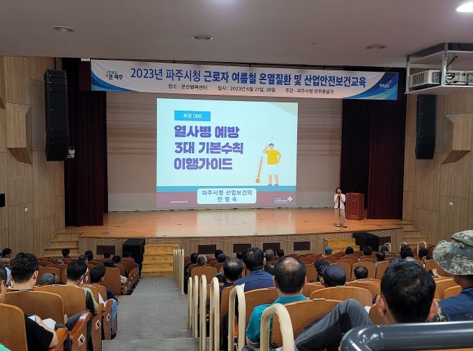 [제주교통복지신문 김강석 기자] 파주시는 6월 27일과 28일 문산행복센터 공연장에서 시 소속 협업업무 종사자 320명을 대상으로 폭염대비 온열질환 및 안전보건 예방 교육을 실시했다.