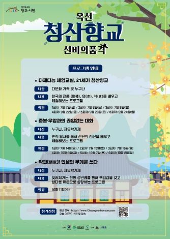 군 관계자는 “관내 향교문화재의 내재된 역사적 의미와 가치를 재창출하기 위해 추진하는 문화재 향유 프로그램이다”며“과거 교육기관이었던 옥천 청산향교의 본래 기능을 활용해 지역 문화재 보존과 애향심 고취에 기여하고, 평소 쉽게 접근하기 어려운 문화재에 대한 이해를 돕기 위한 프로그램인 만큼 많은 군민들의 관심과 참여를 바란다”고 전했다.