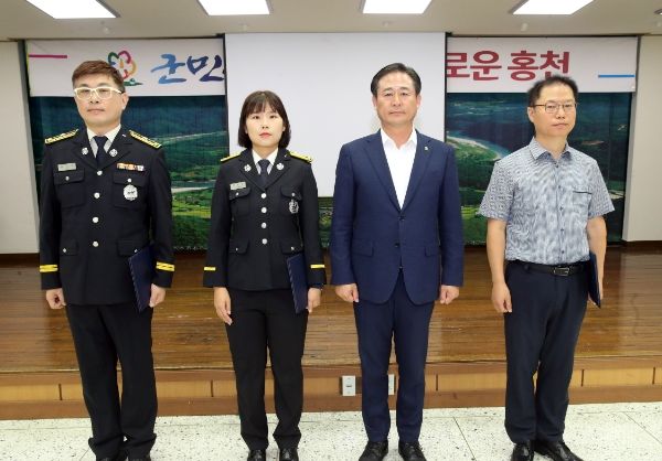 이날 표창장 수여식은 지난 6월 16일 13시 26분경 발생한 동홍천 IC부근 교통사고 현장 조치 공로로 홍천 소방서 김태인 소방위, 최보석 소방사, 조영묵 경위에게 표창장이 전달 됐다.