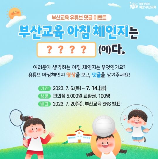 부산광역시교육청은 오는 14일까지 ‘아침 체인지(體仁智)’ 응원 이벤트를 진행한다고 3일 밝혔다.