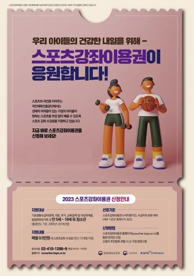스포츠 강좌 이용권 지원 사업은 여가 스포츠 활동에 대해 취약 계층에게 공정한 기회를 제공하기 위한 사업으로, 가맹 체육시설 이용 시 1인당 월 최대 9만 5천 원을 최대 12개월까지 보조금으로 지원한다.