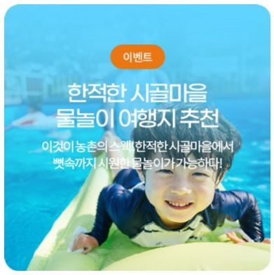 또한, 추천 여행지 8선을 포함한 도내 농촌 지역의 물놀이를 소개하는 사회관계망(SNS) 댓글 이벤트를 통해 경품(1만원권 주유상품권)도 받을 수 있다.