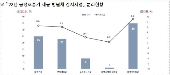 2022년에는 본 감시사업을 통하여 총 5종의 세균 92균주(28.0%)를 분리했고 병원체별로 황색포도알균 35주, 폐렴구균 25주, 모락셀라균 23주, 슈도모나스균 8주, 클렙시엘라 폐렴균 1주를 확인했다.