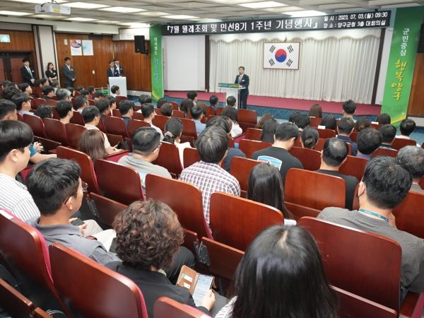 서흥원 양구군수는 “준비의 시간은 끝났으며, 더욱 꼼꼼하고 섬세한 정책으로 실질적으로 군민들께서 피부로 체감할 수 있는 군수로서 역할을 다해나갈 것”이고 “공직자들의 울타리 역할과 군민 여러분의 눈과 귀, 그리고 손과 발의 역할에 주저하지 않을 것”이라며 민선 8기 군정 운영에 최선을 다하겠다는 각오를 밝히며 월례 조회와 기념식을 마무리했다.