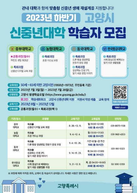 [제주교통복지신문 김강석 기자] 고양특례시는 50세에서 65세 미만의 고양시민을 대상으로 7월 3일(월)~7월 28일(금)까지 2023년 하반기 고양시 신중년대학 학습자 150명을 모집한다. 고양시 신중년대학은 관내 4개 대학과 연계하여 인생 2막을 재설계하는 교육과정이다.