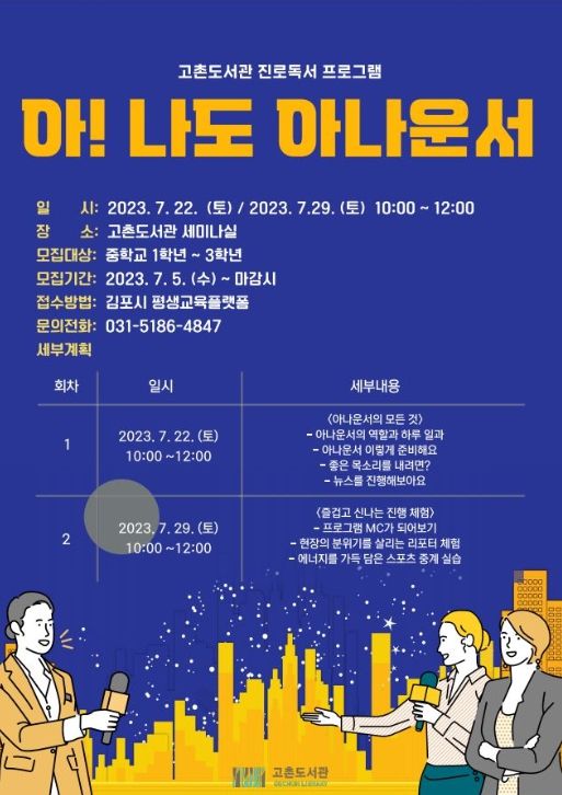 [제주교통복지신문 김강석 기자] 김포시 고촌도서관은 7월 22일과 29일 토요일 오전 10시부터 12시까지 총 2회에 걸쳐 고촌도서관 7층 세미나실에서 청소년 진로독서 프로그램 ‘아! 나도 아나운서’를 운영한다.