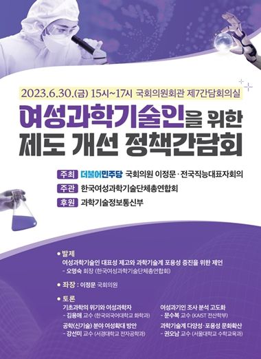 [제주교통복지신문 김강석 기자] 6월 30일, 이정문 국회의원(충남 천안병)과 더불어민주당 전국직능대표자회의가 주최하고, 한국여성과학기술단체총연합회가 주관하며 과학기술정보통신부가 후원한 '여성과학기술인을 위한 제도 개선 정책간담회'가 성료했다.