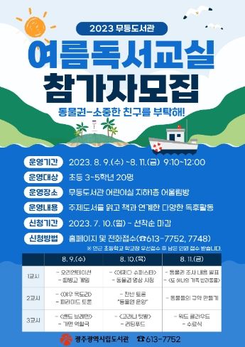 [제주교통복지신문 김강석 기자] 광주광역시립도서관(무등·사직·산수)은 여름방학을 맞은 초등학생을 대상으로 세 가지 주제의 ‘여름독서교실’을 운영한다.