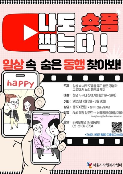 [제주교통복지신문 김강석 기자] 서울시자원봉사센터는 7월 3일부터 8월 20일까지 2023 서울동행 영상 공모전 '일상 속 숨은 동행 찾아봐!'을 개최한다.