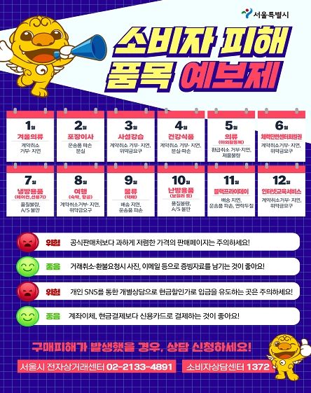 정덕영 서울시 공정경제담당관은 “시민들의 합리적인 소비와 공정한 거래환경 조성을 위해 반복되는 소비자피해 유형을 분석하고 피해예방 정보를 지속적으로 제공해 시민들의 안전한 소비생활을 돕겠다”고 말했다.
