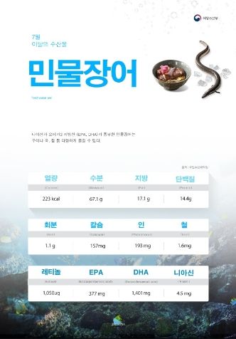 [제주교통복지신문 김강석 기자] 해양수산부가 무더운 여름철 보양식으로 좋은 7월 이달의 수산물로 민물장어와 다슬기, 조피볼락을 선정했다.