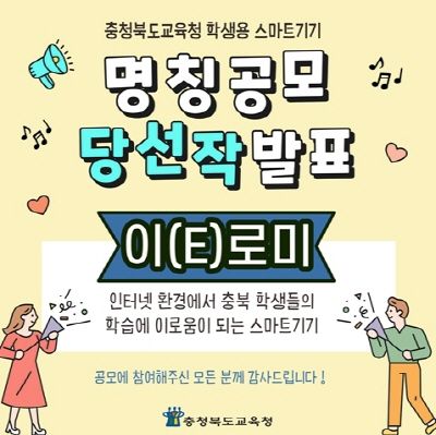 당선작 ‘이(E)로미’는 인터넷 하면 떠오르는 알파벳 E와 동일 발음인 한자 ‘이로울 이(利)’를 합친 말로, “충북 학생들의 학습에 이로움이 되는 스마트기기”라는 의미이며, 당선작에는 30만원 상당의 상품이 지급된다.