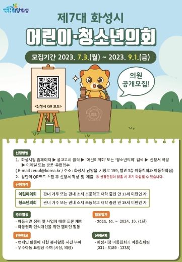 아동의회는 ▲어린이의회(13세 미만, 초등학교 5학년까지) ▲청소년의회(18세 미만, 초등학교 6학년부터 고등학교 2학년까지)로 구분되며, 화성시에 주소가 되어 있거나 관내 학교 재학생이면 지원할 수 있고, 모집기간은 이달 3일부터 9월 1일까지이다.