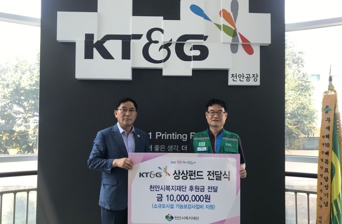 정지표 이사장은 “매년 소중한 나눔을 실천해주고 계신 KT&G천안공장 임직원께 감사드리며, 소규모 시설이 환경개선을 통해 사업을 안정적으로 운영할 수 있도록 후원금을 소중히 사용하겠다”고 전했다.