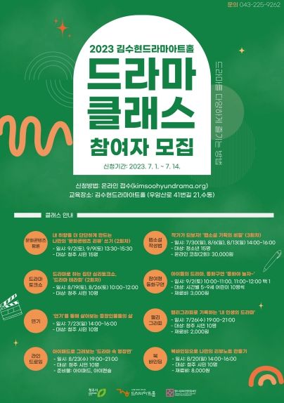 클래스는 7월 23일부터 9월 9일까지 각각의 일정에 따라 드라마아트홀에서 운영되며, 운영 시간 및 재료비는 강좌 별로 상이하다.