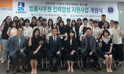 [제주교통복지신문 김강석 기자] 수원시와 아주대학교 로스쿨(법학전문대학원)은 3일 아주대학교 캠퍼스플라자에서 ‘2023 로스쿨 법률사무원 인력양성 지원사업’ 개강식을 열었다.