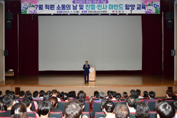 오후 4시부터는 거제시청소년수련관에서 직원들과 소통의 시간을 가졌다. 직원 소통의 날 행사에서는 박 시장 취임 이후 1년 간의 발자취와 동료 직원 간의 이야기를 담은 영상을 시청하고, 유공자 표창을 수여했다. 참석한 직원들은 민선8기에서 강조하는 친절 인사 마인드 함양 강의를 들으며, 민원서비스 향상과 행정 신뢰감 조성에 대해 생각하는 시간을 가졌다.
