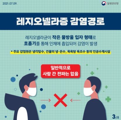 레지오넬라증은 제3급 법정감염병인 급성 호흡기 질환으로 레지오넬라균은 주로 대형건물의 냉각탑수, 냉·온수 급수시스템 등 따뜻하고 오염된 물 속 환경(PH 7.2~8.3, 온도 25~45℃)에서 잘 번식하고, 증식한 균이 비말형태(날아 흩어지는 물방울)로 호흡기를 통해 인체로 들어가 감염된다.