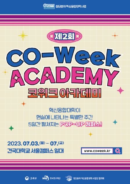 이번 출범식 행사는 ‘제2회 코-위크(CO-Week) 아카데미’와 연계하여 진행된다. 코-위크 아카데미는 첨단분야 혁신융합대학의 우수 콘텐츠를 실제 캠퍼스 형태로 구현한 것으로, 7월 3일(월)부터 7월 7일(금)까지 건국대학교 서울캠퍼스에서 열릴 예정이다. 학생들은 첨단분야 혁신융합대학의 모든 연합체가 운영하고 있는 강좌, 프로그램에 직접 참여할 수 있다.